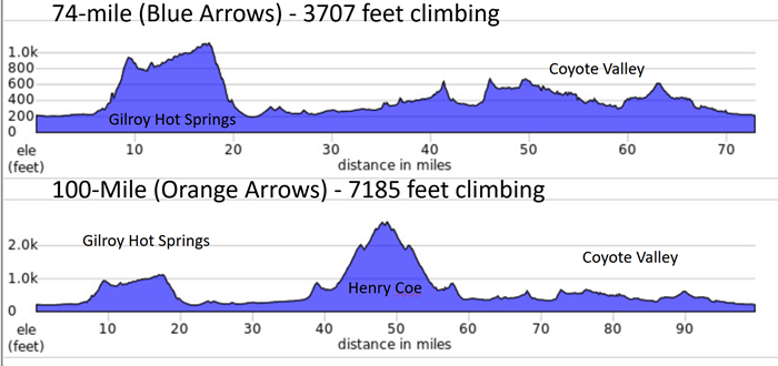 This century ride contains all of the options from the routes. First you climb up to Gilroy Hot Springs and descend Canada Rd. Then you go north past San Martin before starting the challenging climb up to Henry Coe. You next across Morgan Hill and climb up Willow Springs Rd, past Chesbro Reservoir then head south and stop at the Uvas reservoir rest stop before continuing to Redwood Retreat and the finish in Gilroy. Follow the orange arrows.