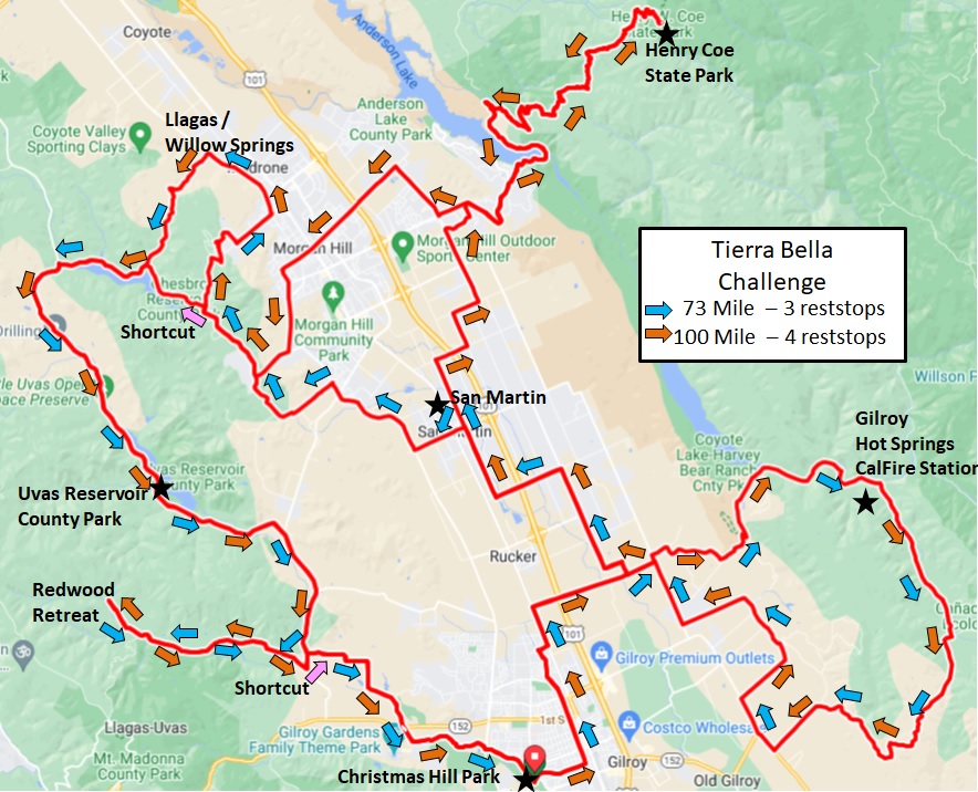 This route starts off with the traditional climb up to Gilroy Hot Springs followed by a descent of Canada Rd. Then you head north to San Martin, before continuing into Morgan Hill. Continuing north, you climb up Willow Springs Rd, past Chesbro Reservoir and then turn south, stopping at the Uvas reservoir rest stop before continuing to Redwood Retreat and the finish in Gilroy. Follow the blue arrows.