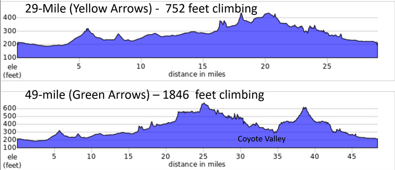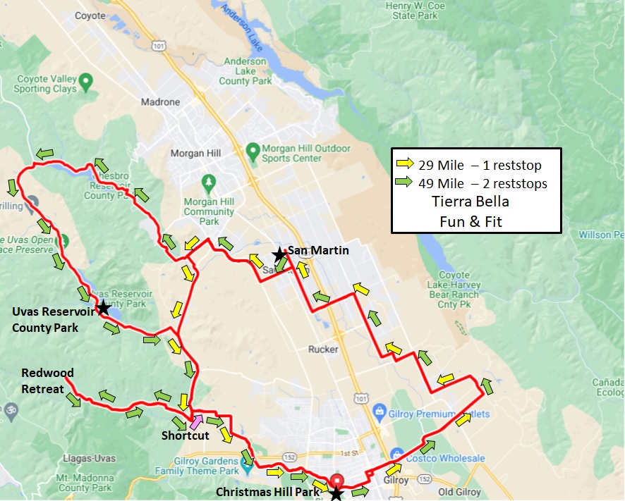 If you have not ridden much over the winter, we recommend this relatively flat route through Gilroy and a big loop out to San Martin Heading west and loop around bucolic roads near Gilroy. There are lots of new roads and scenery to experience on this shorter route. Follow the yellow arrows.